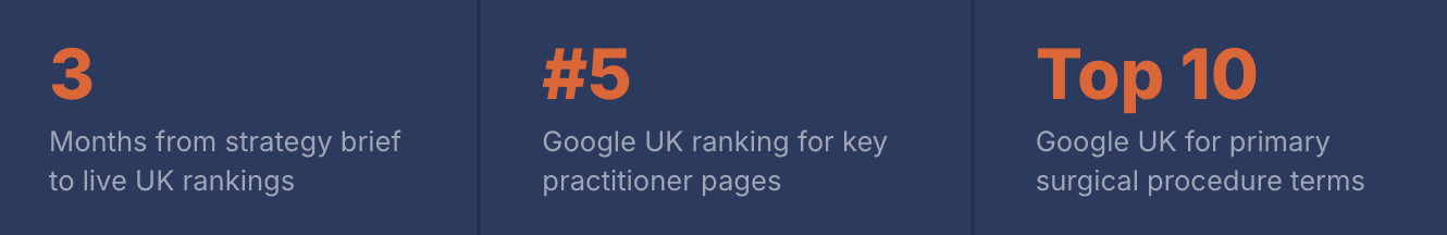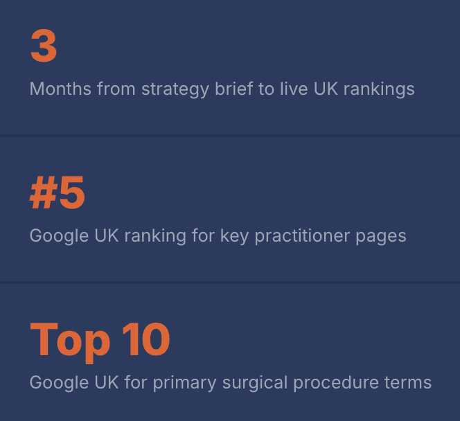 Individual doctor pages ranking position 5 for relevant search terms in the UK market.